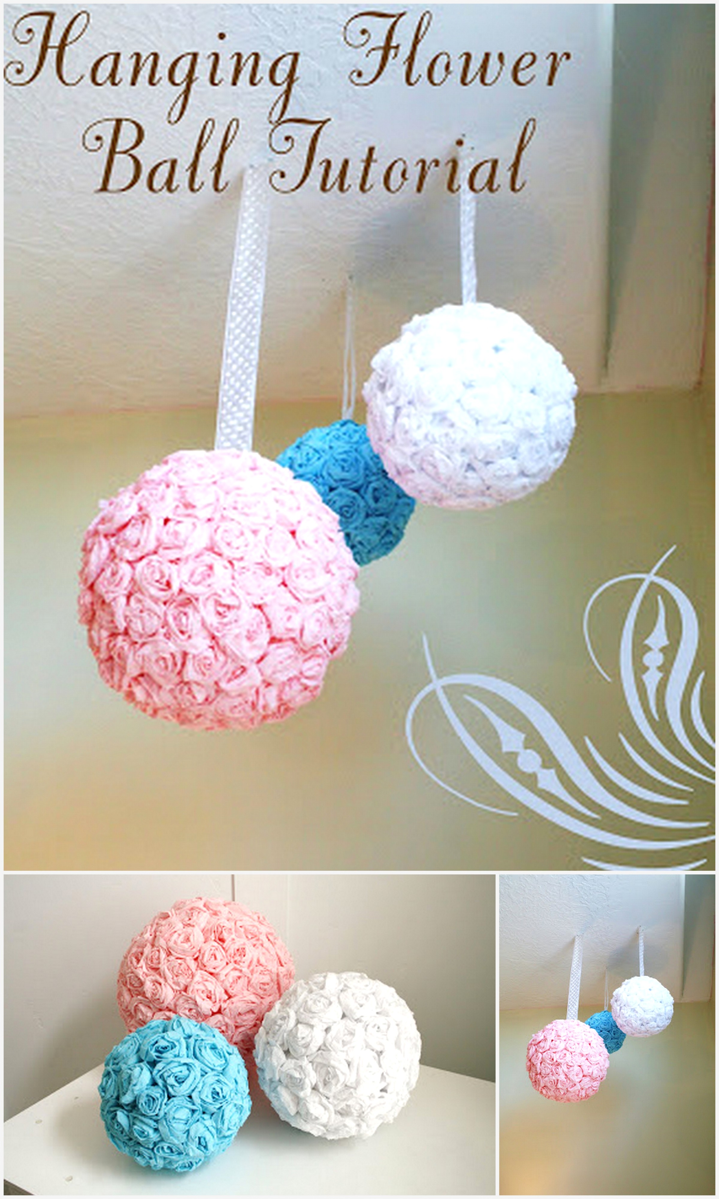 Hanging roses in balls form paper DIY decoration! Blossoms are a glorious decision of divider stylistic theme and when they are made of paper they can never shrivel! You can make them in any shading or size you wish, yet we suggest you start with pink and light blue shade like in the below image!