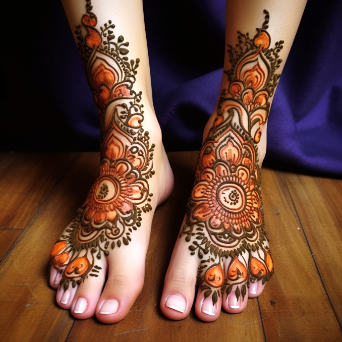 Starting at the tips of your toes, delicate patterns gently adorn each nail, setting the stage for the design’s graceful journey. As the design moves upward, it unfurls into a mesmerizing array of motifs, each stroke carrying the weight of tradition and significance. The feet become a canvas of intricate artistry, where flowers, curves, and swirls intertwine to create a visual symphony.