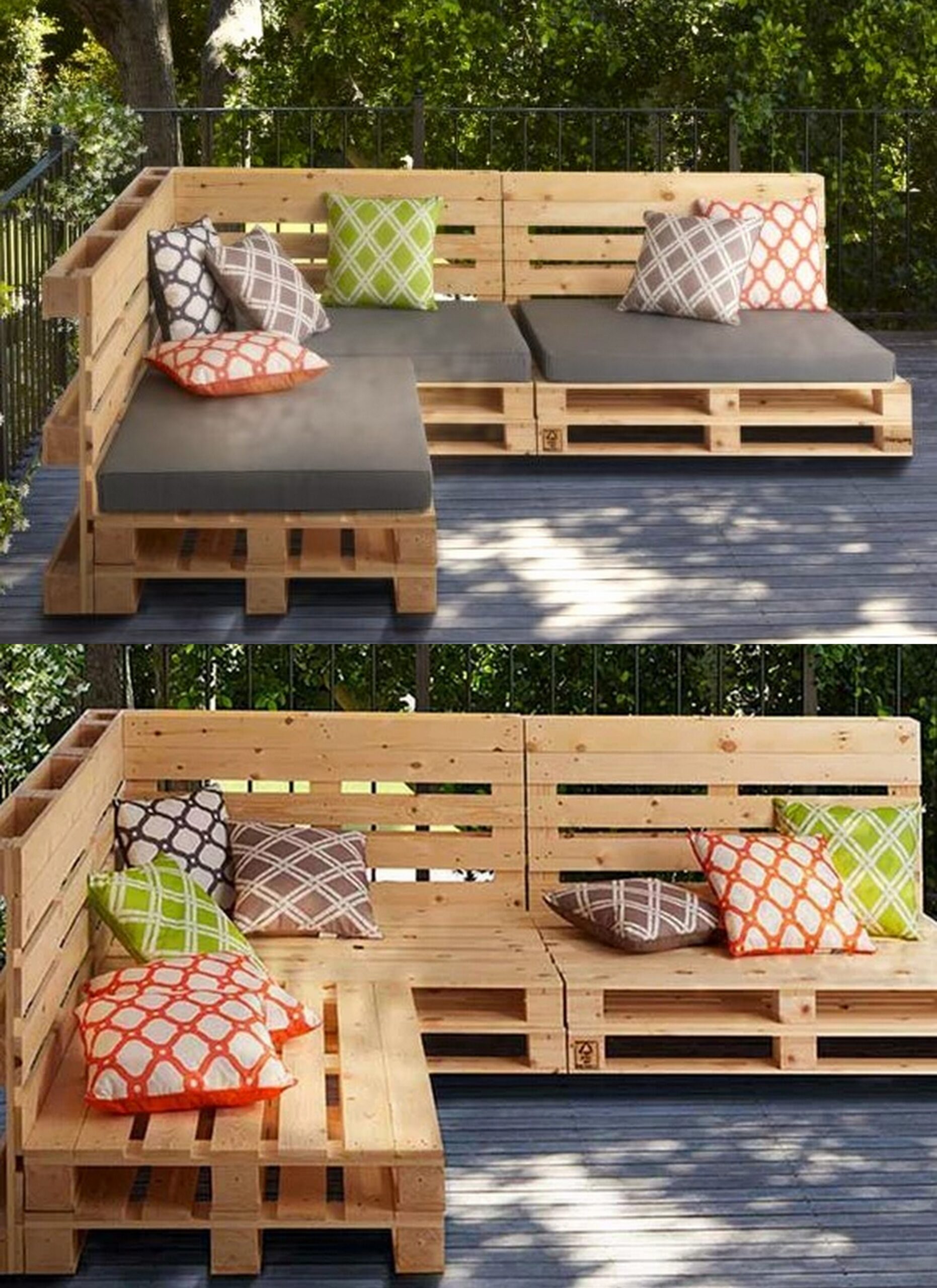 To secure the pallets together, use sturdy L-brackets or screws to prevent them from shifting. Add a layer of foam or outdoor cushions to the seat for comfort and cover them with weather-resistant fabric. This not only makes your DIY couch comfortable but also adds a touch of style and color to your outdoor space.
